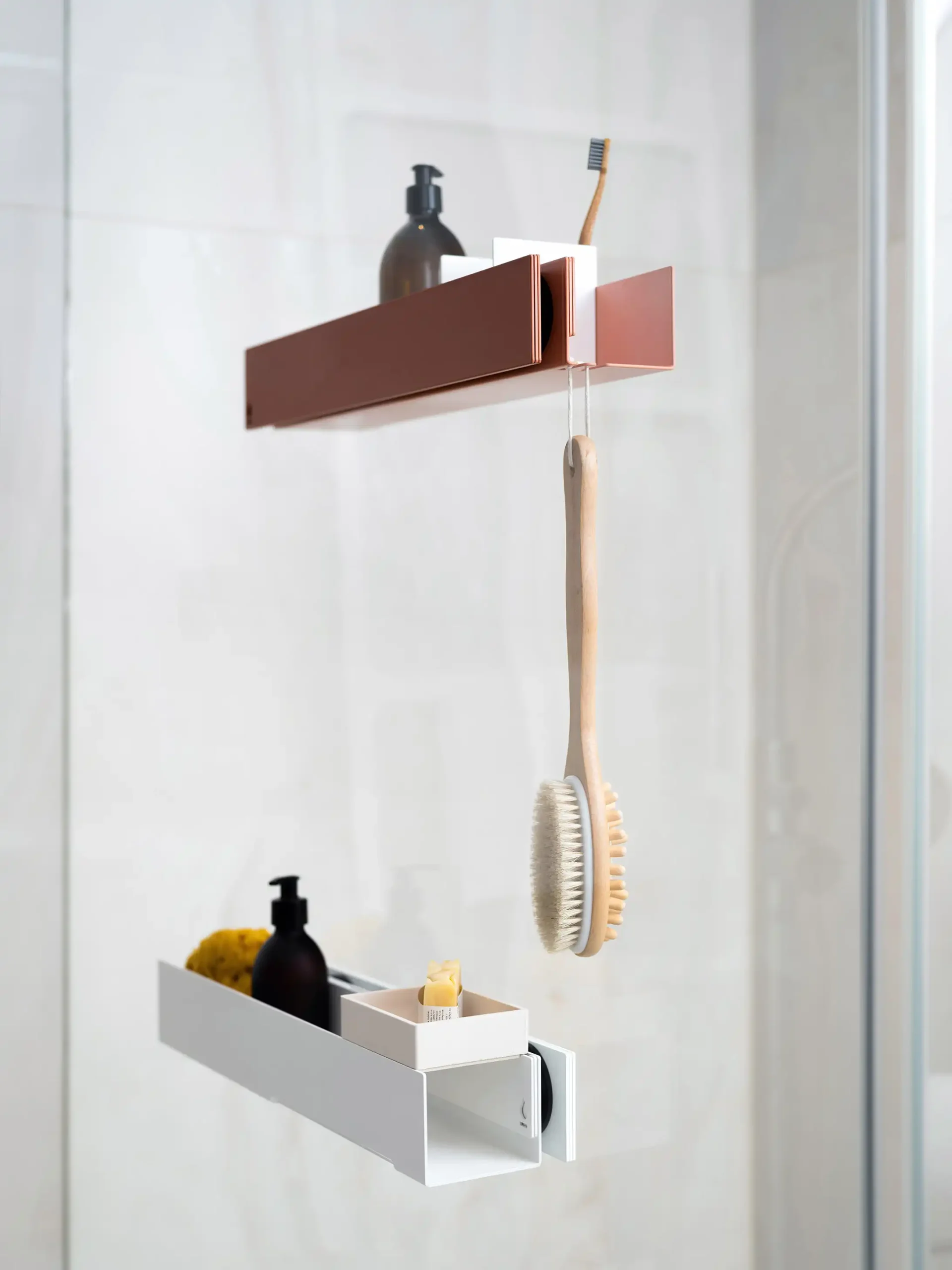 All this is true of the be_myshelf bathroom shelf installation. Its charm lies in the strong magnets that are fitted to both the shelf and the same-coloured moulding, which is approached from the other side of the glass shower screen and… Click! The two parts are pulled together by magnetic force, you’re done and you can go have a flat white.