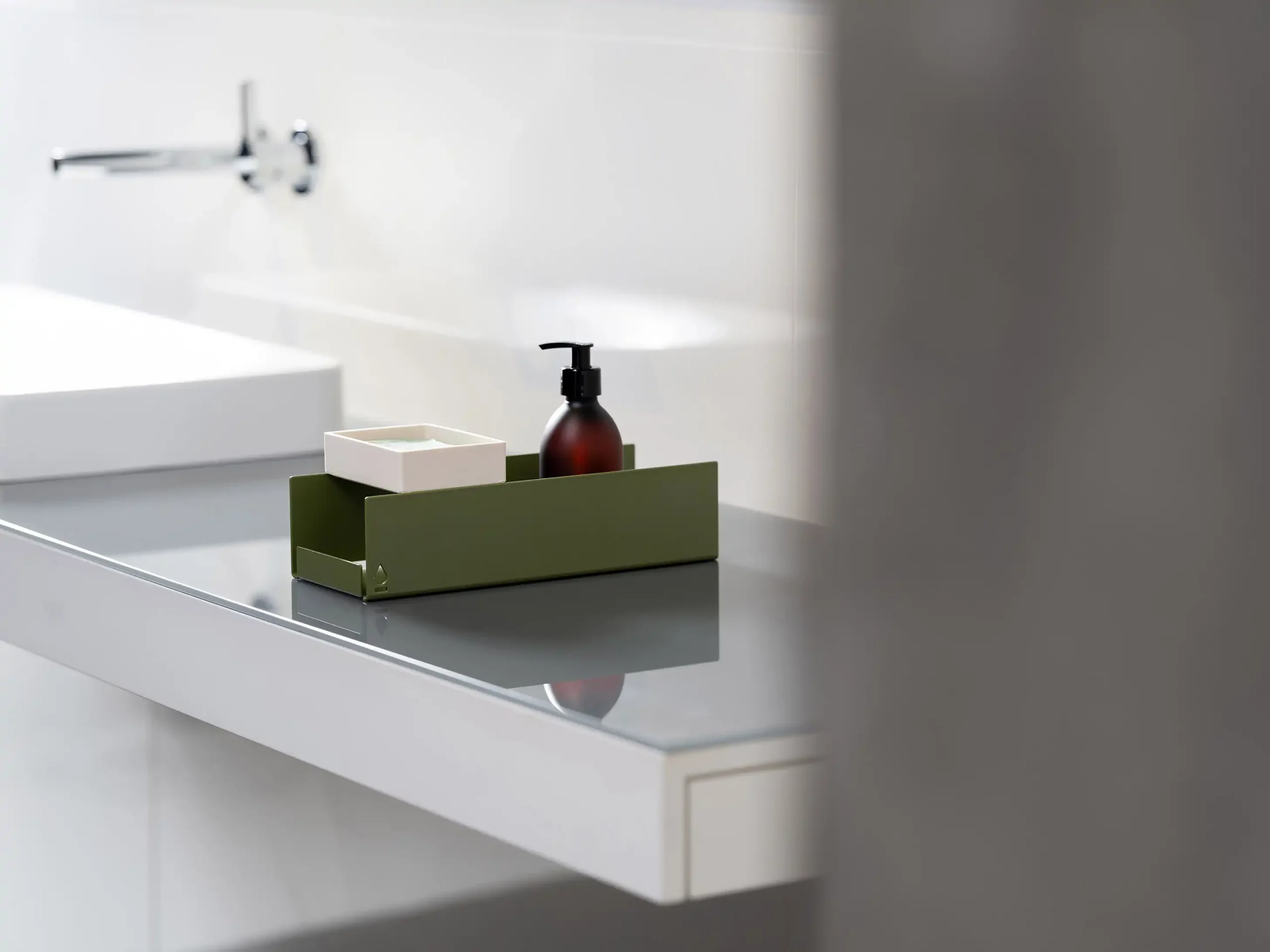 The soap tray is designed as a modular element that fits both the be_myshelf and the basin tray. It is made of artificial stone using a hand-casting method. It is pleasant to the touch, at the same time easy to maintain, each piece is original.
